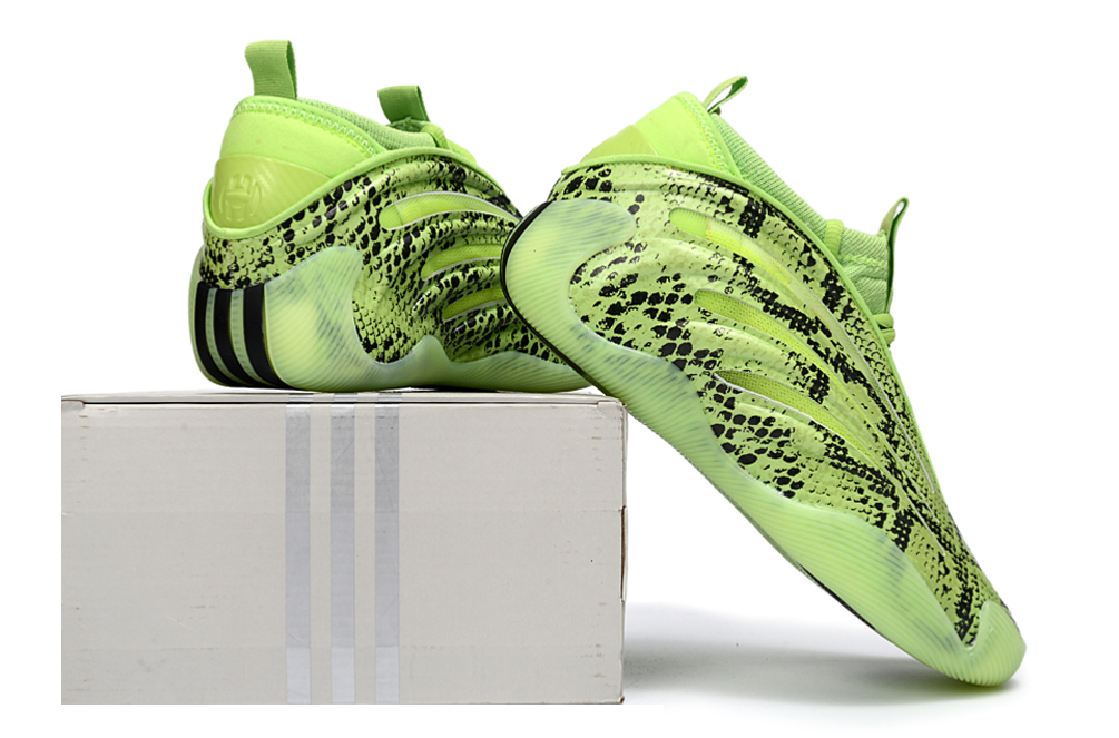 Модель Harden Vol. 9 “Snakeskin” выполнена в ярком солнечно-зелёном цвете (“Solar Slime”) с чёрным змеиным принтом, что придаёт ей агрессивный и уникальный внешний вид. Этот стиль подчёркивает непредсказуемость и смертоносность игры Хардена, вдохновляя игроков чувствовать себя уверенно и выделяться на паркете.