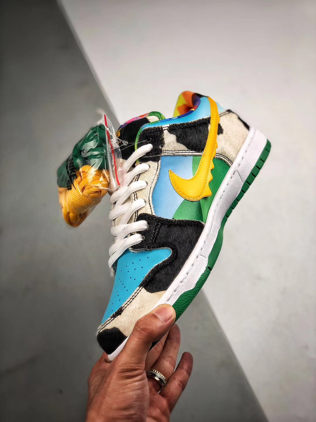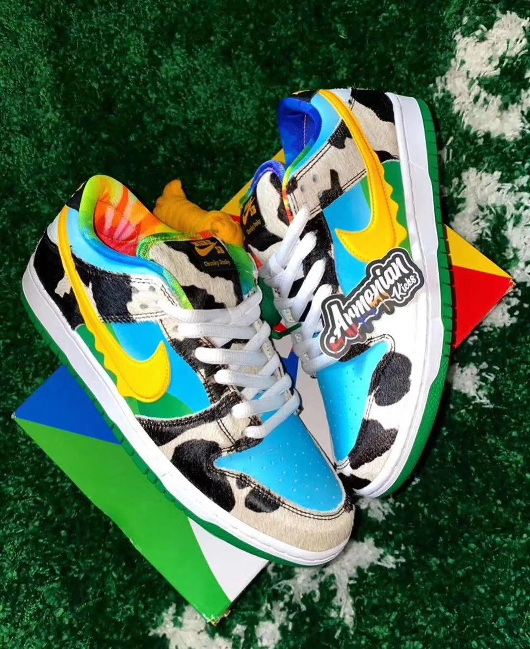Коллаб Ben & Jerry’s x Nike SB Dunk Low «Chunky Dunky» будет сложно не заметить. Кроссовки получили дикий микс из разных материалов и оттенков. Здесь можно найти текстиль, резину, пластик и даже искусственный мех в «коровьих» оверлеях и на язычке. Сам же колорвей навеян природой, полем, небом и солнцем.